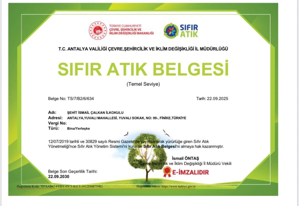 Okulumuz Sıfır Atık Yönetmeliği'nce Sıfır Atık Belgesini Almaya Hak Kazanmış Olup 22.09.2025 tarihi itibari ile belgemiz yenilenmiştir.